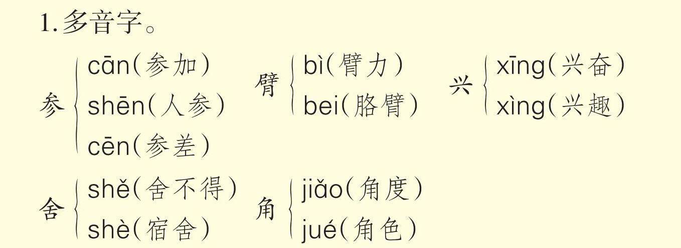 一、字词积累。 1.多音字。 [cān(参加) shēn(人参) cēn(参差)][参][{] [bì(臂力) bei(胳臂)][臂][{] [xīng(兴奋) xìng(兴趣)][兴][{] [shě(舍不得) shè(宿舍)][舍][{] [jiǎo(角度) jué(角色)][角][{] 2.优美词语。 (1)四字词语:五光十色 瑰丽无比 成群结