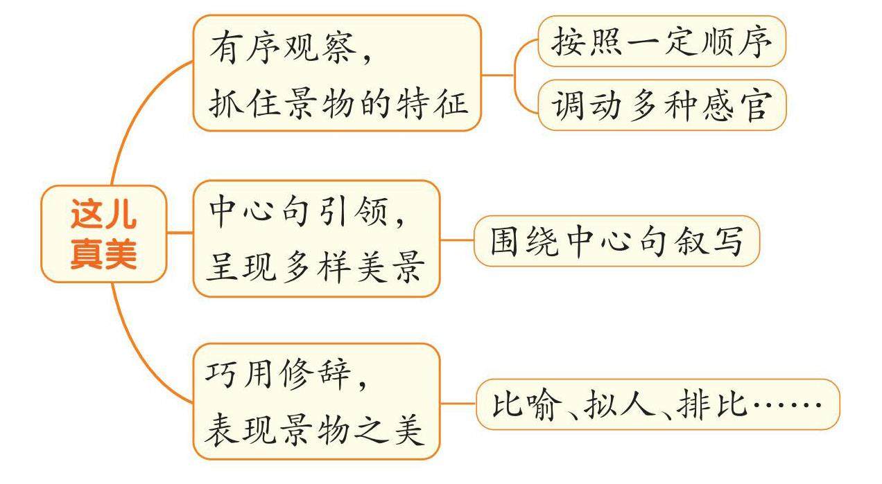 花园里,五彩缤纷;果园里,硕果累累;田野里,庄稼丰收;小河里,鱼儿跳跃……我们周围有许多美丽的地方,那些地方令人流连忘返。今天,就让我们把身边的美景介绍给大家吧! 一、有序观察,抓住景物的特征。 每个地方的景色各不相同,你要介绍哪里的美景?是春天的小花园,是秋天的小树林,还是公园的小荷塘?无论介绍哪里,我们都要按一定顺序,或由远及近,或从上到下,调动视觉、听觉、嗅觉等多种感官,认真观察景物,抓