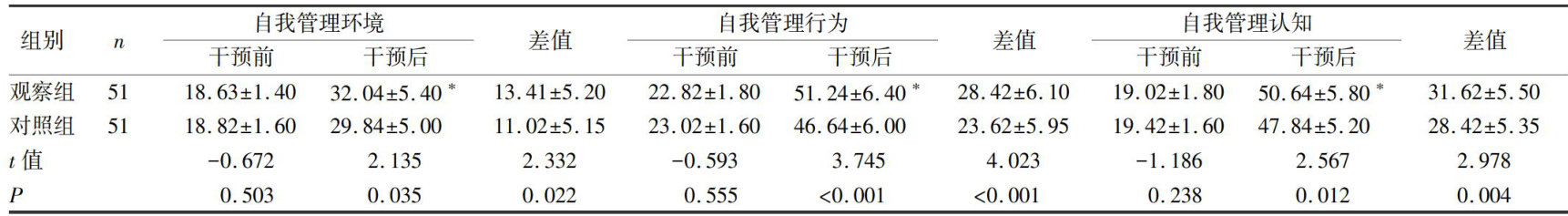 【摘要】目的:探讨赋能理论指导下的自我管理对玻璃体积血患者的影响。方法:选取2023年1月—12月就诊的99例玻璃体积血患者作为研究对象。采用随机数字表法将其分为观察组和对照组,对照组50例围术期接受常规护理管理,观察组49例围术期在常规护理管理基础上实施赋能理论指导下的自我管理;对比两组眼压水平、自我管理能力[采用成年人健康自我管理能力测评量表(AHSMSRS)]、生活质量[采用中文版低视力者生活质量量表(CLVQOL)]、护理满意度。结果:术后3d,观察组眼压低于对照组( .P<0.01 );护理后,两组CLVQOL各维度评分、AHSMSRS评分均高于护理前( P<0.01 ),且观察组高于对照组( P< 0.01);观察组护理总满意度高于对照组( P<0.05) )。结论;玻璃体积血患者围术期采取赋能理论指导下的自我管理有助于提升患者自我管理能力,提高患者术后生活质量以及护理满意度。