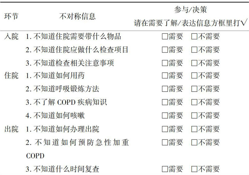 【摘要】目的:探讨信息不对称理论下共同决策护理在慢性阻塞性肺疾病(COPD)患者中的应用效果。方法:选取2020年5月—2022年5月收治的103例COPD患者,按照随机数字表法分为对照组51例和观察组52例,分别给予常规护理、常规护理 + 信息不对称理论下共同决策护理;比较两组遵医行为、干预前后肺功能[包括第1秒用力呼气容积( FEV1 )、 FEV1 /用力肺活量( FEV1/FVC )、呼气峰流速(PEF)、最大呼气中段平均流量(MMEF)]、自我管理能力、生活质量[采用圣乔治呼吸问卷(SGRQ)]、负性情绪[采用焦虑自评量表(SAS)、抑郁自评量表(SDS)]及护理满意度。结果;观察组遵医行为优良率高于对照组( (P<0.01) ;干预后,两组PEF、 FEV1 、MMEF、 FEV1 /FVC水平、自我管理能力各维度评分及总分均高于干预前( P<0.05 ),且观察组高于对照组( P<0.05) ;干预后,两组SDS、SAS评分及SGRQ各维度评分均低于干预前( P<0.05. ),且观察组低于对照组( P<0.01 );观察组总满意度高于对照组( P<0.05. )。结论:信息不对称理论下共同决策护理应用于COPD患者,可增强其遵医行为,提高自我管理能力,从而改善患者身心状态,促进预后肺功能好转,还能提升生活质量和患者满意度。