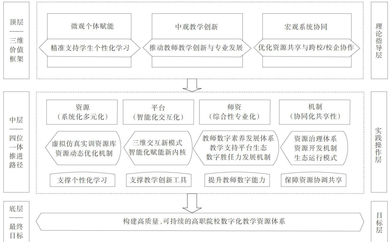 [摘要]基于教育生态理论推进数字化教学资源建设,在微观层面可以精准赋能学生个性化学习,中观层面驱动教师教学创新与专业发展,宏观层面优化资源共享与协同机制。当前高职院校资源建设存在数字化资源建设系统性不足、数字化教学平台建设结构性失衡、师资队伍数字化胜任力不足、数字化资源共享机制不均衡等问题。对此,需构建“三维价值一四位一体”推进框架,建设系统、多元的资源体系,打造智能化交互性平台,培育教师的数字胜任力,建立协同共享生态,以期最终建成高质量、可持续的数字化教学资源体系。