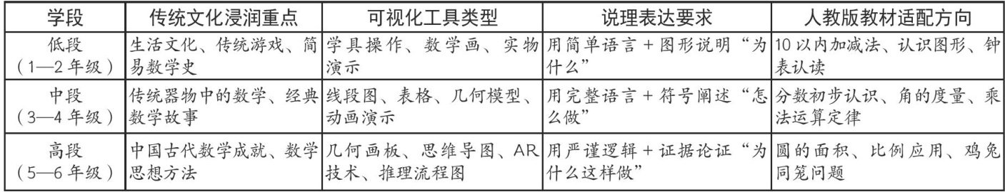 摘要:小学数学课堂是落实立德树人根本任务的基础场域,《义务教育数学课程标准(2022年版)》明确要求“注重文化浸润,引导学生感悟数学的文化价值,发展核心素养”。本文立足小学生以具象思维为主的认知特点,构建“传统文化浸润+可视化说理”的育人新范式。该范式以“概念教学、运算教学、几何教学、解决问题教学”四大模块为框架,通过“传统文化情境导入—可视化工具探究—说理表达深化一文化价值升华”的实操流程,展现新范式的落地路径。其目标是让数学知识从“抽象符号”变为“可感体验”,让文化传承从“形式附加”变为“内涵融入”,最终实现小学数学课堂“知识传授一思维发展一文化育人”的一体化目标。
