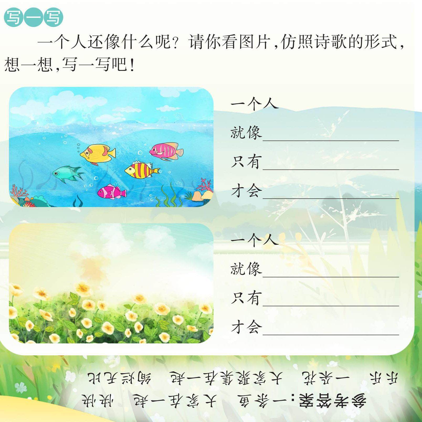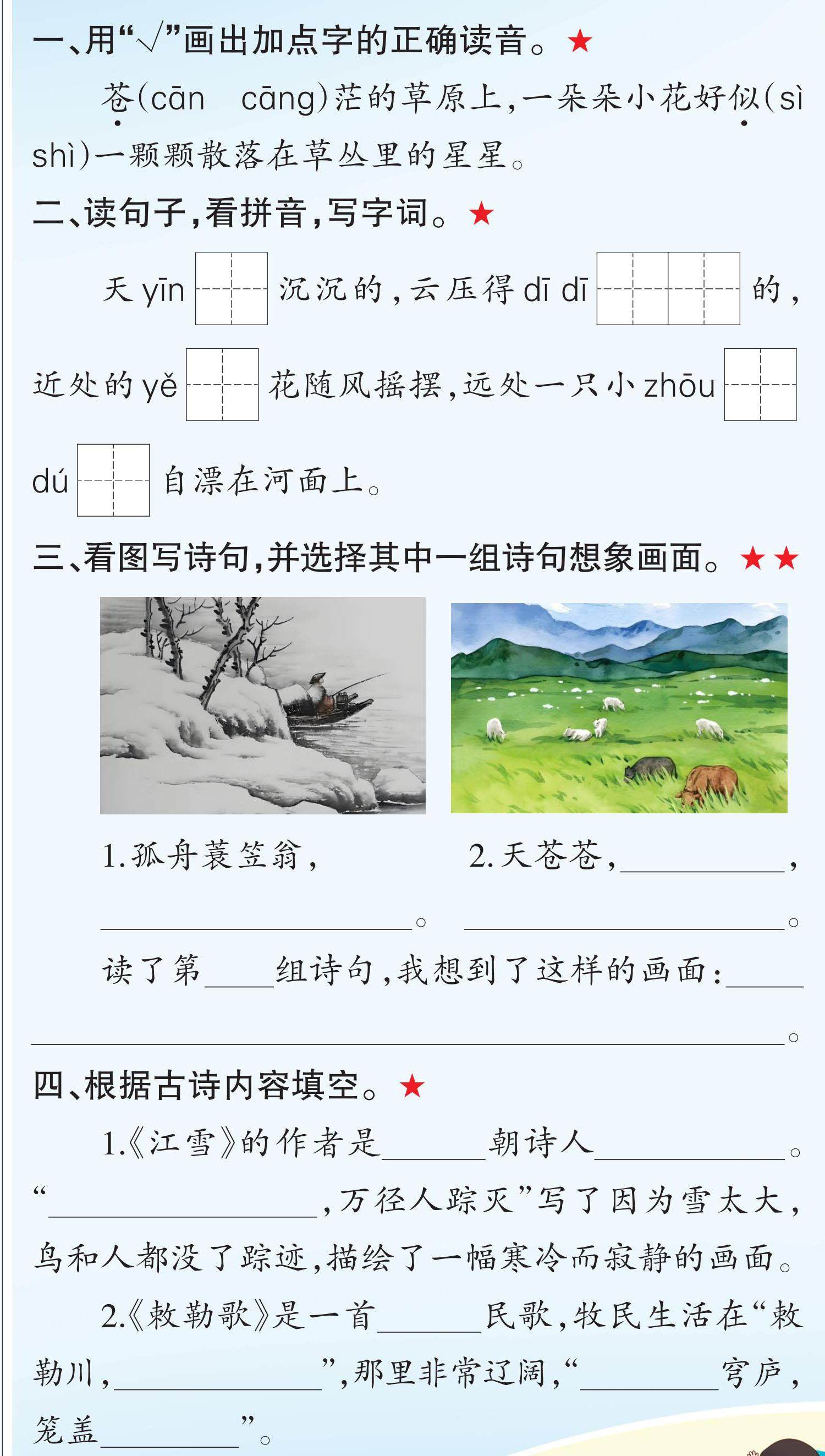 一、用“√”画出加点字的正确读音。★ 苍(cān cāng)茫的草原上,一朵朵小花好似(sì shì)一颗颗散落在草丛里的星星。 二、读句子,看拼音,写字词。★ 天yīn[][ ]沉沉的,云压得dī dī[][ ][ ]的,近处的yě[][ ]花随风摇摆,远处一只小zhōu[][ ]dú[][ ]自漂在河面上。 三、看图写诗句,并选择其中一组诗句想象画面。★★ <E:\2025-2