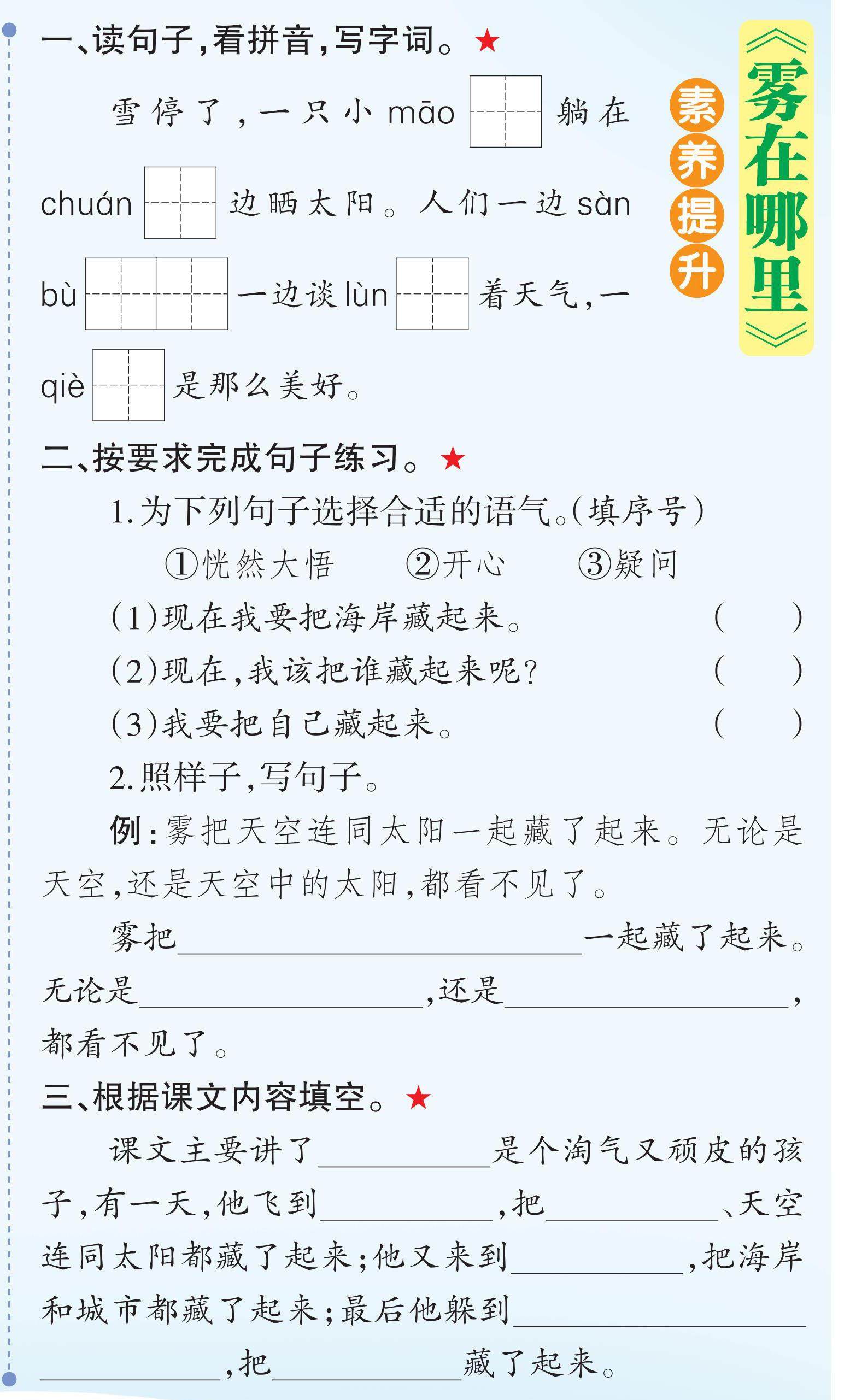 一、读句子,看拼音,写字词。★ 雪停了,一只小māo[][ ]躺在chuán[][ ]边晒太阳。人们一边sàn bù[][ ][ ]一边谈lùn[][ ]着天气,一qiè[][ ]是那么美好。 二、按要求完成句子练习。★ 1.为下列句子选择合适的语气。(填序号) ①恍然大悟 ②开心 ③疑问 (1)现在我要把海岸藏起来。 ( ) (2)现在,我该把谁藏起来呢? (