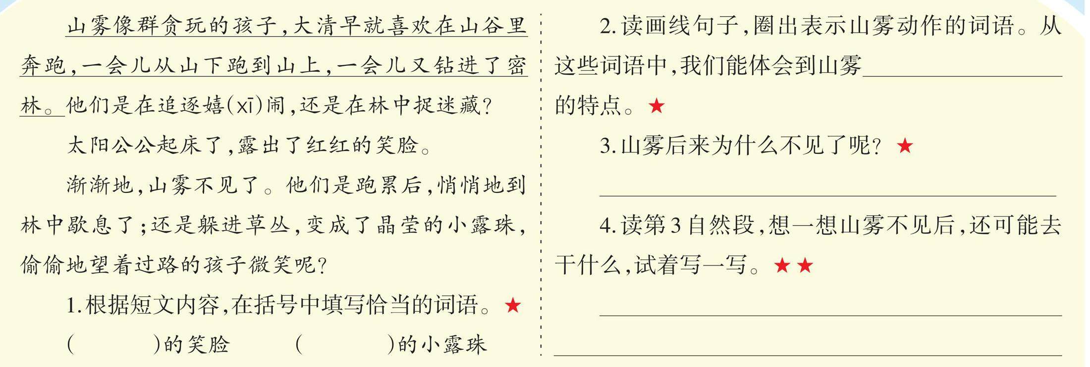 山雾像群贪玩的孩子,大清早就喜欢在山谷里奔跑,一会儿从山下跑到山上,一会儿又钻进了密林。他们是在追逐嬉(xī)闹,还是在林中捉迷藏? 太阳公公起床了,露出了红红的笑脸。 渐渐地,山雾不见了。他们是跑累后,悄悄地到林中歇息了;还是躲进草丛,变成了晶莹的小露珠,偷偷地望着过路的孩子微笑呢? 1.根据短文内容,在括号中填写恰当的词语。★ ( )的笑脸