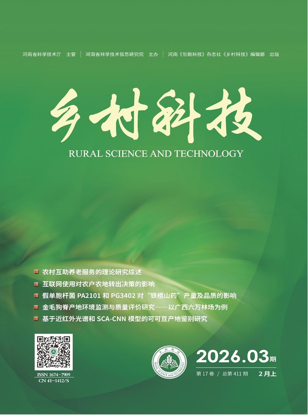 《乡村科技》是经国家新闻出版署批准,由河南省科技厅主管,面向国内外公开发行的一本优秀农业科技刊物,荣获2013年度河南省自然科学一级期刊。本刊主要栏目有:三农论坛(管理、综述、推广、教育)、农业经济(经济类非技术文章)、园林绿化(林业、景观、绿化)、种植大观(种植技术、植保、瓜果蔬菜)、养殖技术(养殖技术、水产、渔业、兽医)、资源与环境(土肥、能源、水污染、气象)、农业工程(环保、信息化、农机)。