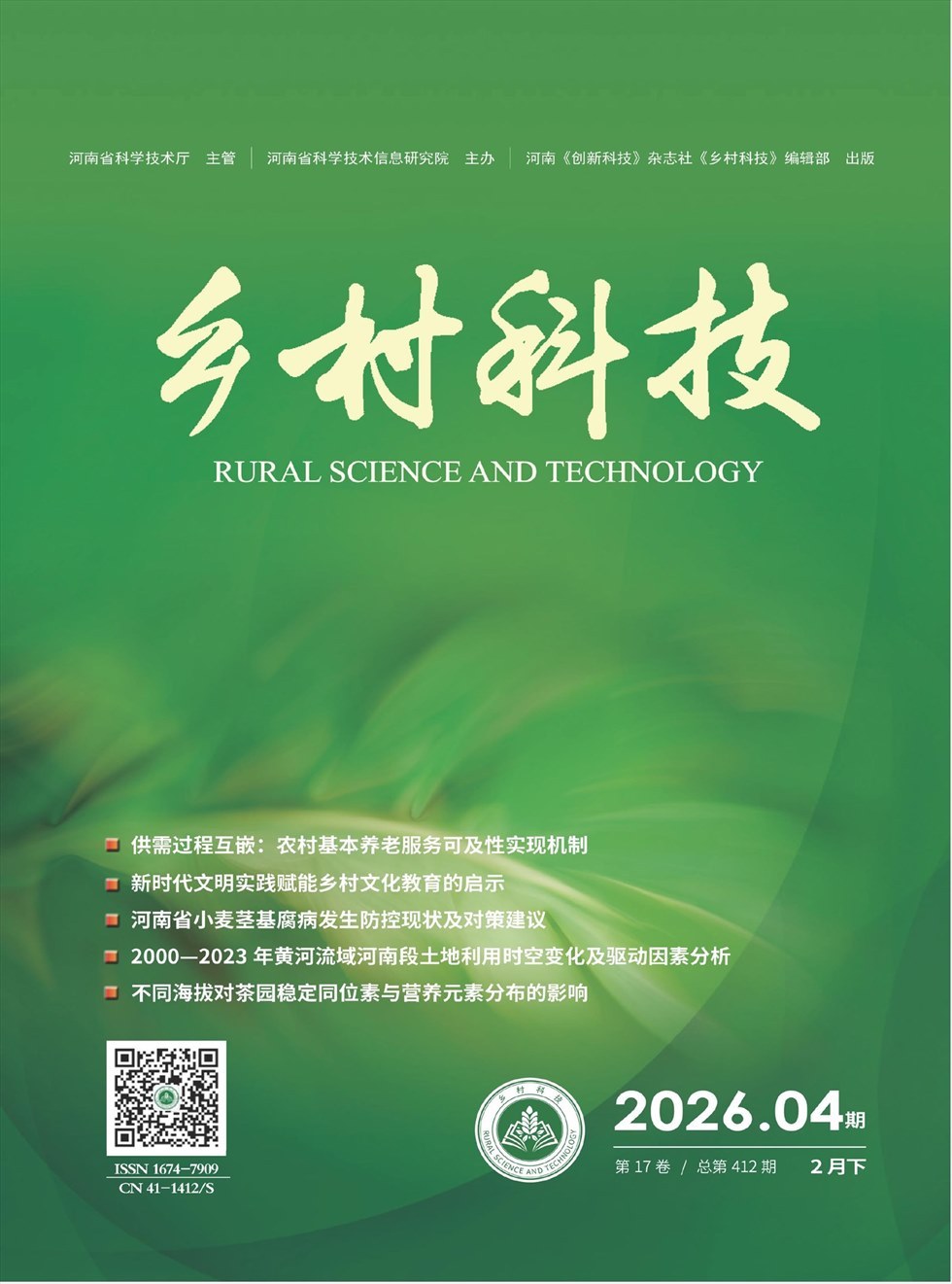 《乡村科技》是经国家新闻出版署批准,由河南省科技厅主管,面向国内外公开发行的一本优秀农业科技刊物,荣获2013年度河南省自然科学一级期刊。本刊主要栏目有:三农论坛(管理、综述、推广、教育)、农业经济(经济类非技术文章)、园林绿化(林业、景观、绿化)、种植大观(种植技术、植保、瓜果蔬菜)、养殖技术(养殖技术、水产、渔业、兽医)、资源与环境(土肥、能源、水污染、气象)、农业工程(环保、信息化、农机)。